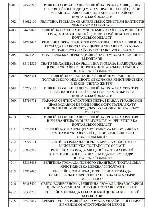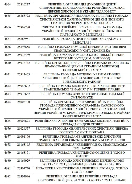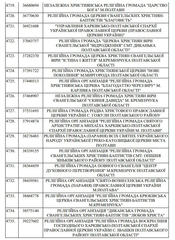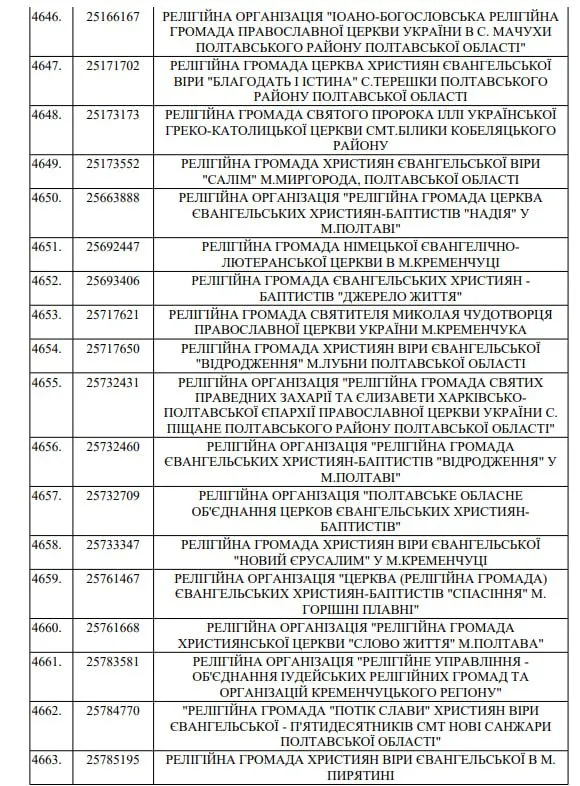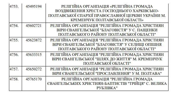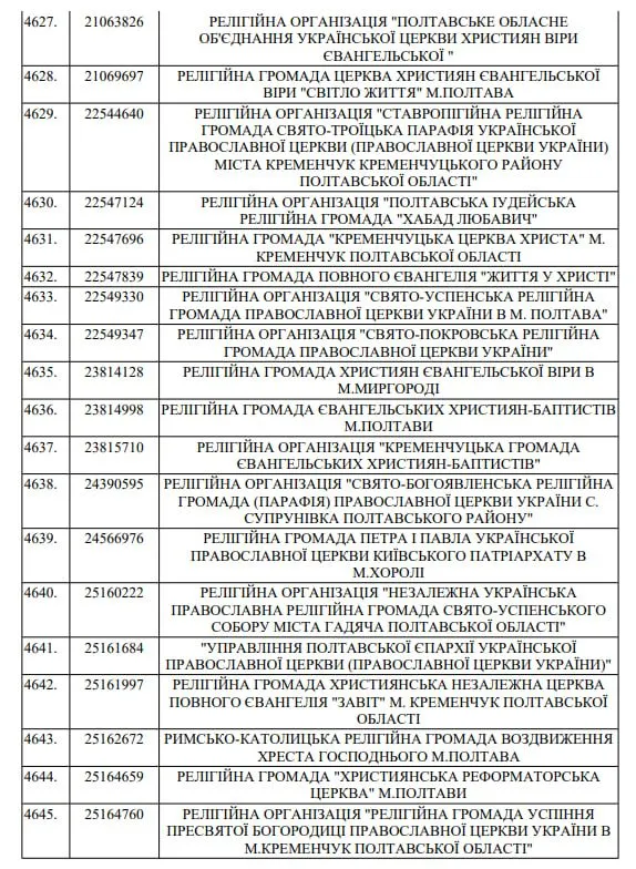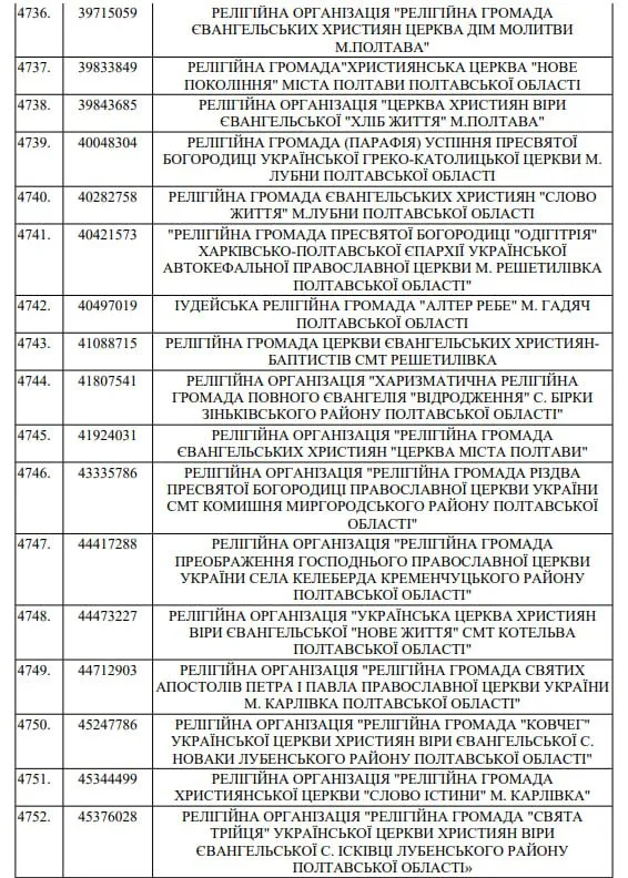 До переліку увійшли 133 релігійні організації та громади з усієї нашої області: Хоролу, Кременчука, Полтави, Миргорода, Гадяча, Лубен, Біликів, Горішніх Плавнів, Пирятина, Нових Санжар та інших населених пунктів.