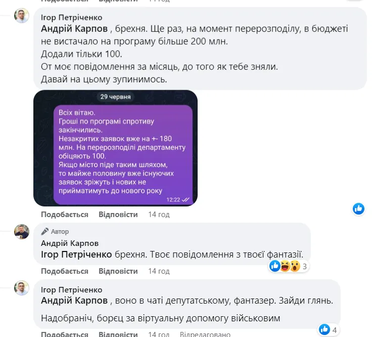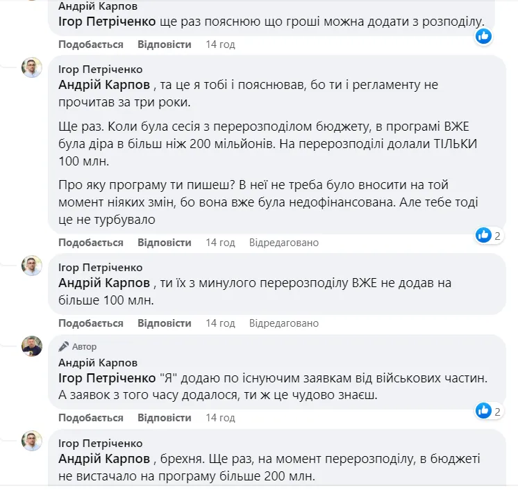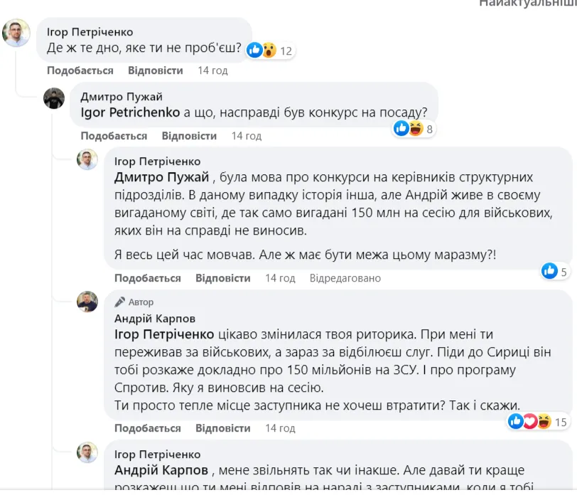 «Була мова про конкурси на керівників структурних підрозділів. В даному випадку історія інша, але Андрій живе в своєму вигаданому світі, де так само вигадані 150 млн на сесію для військових, яких він на справді не виносив. Я весь цей час мовчав. Але ж має бути межа цьому маразму?!».