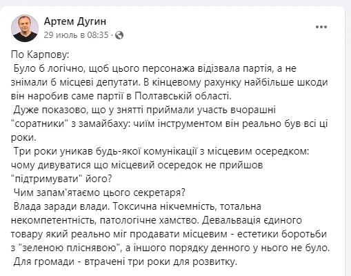 Вже після зняття Карпова з посади секретаря міської ради, відомий полтавський ЄеСівець Артем Дугін на своїй сторінці у Facebook зробив допис з гострою критикою Карпова. Передаємо допис дослівно: