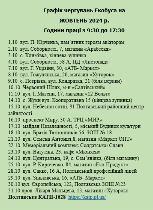 На сайті Полтавського комунального автотранспортного підприємства 1628 оприлюднили графік чергувань екобуса у Полтаві на жовтень. Екобус приймає відходи, які потребують спеціальної утилізації, зокрема, батарейки, ртутні термометри, люмінесцентні лампи, акумулятори до мобільних телефонів.