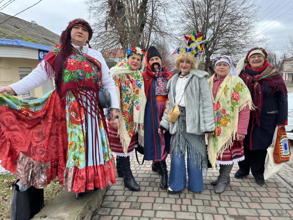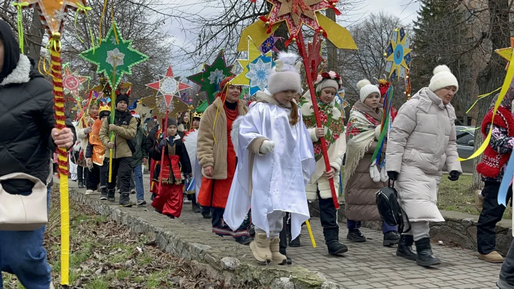 За кілька сотень метрів від святкового ярмарку, вниз вулицею Шевченка, почав виднітися гурт яскраво убраних людей. Вертеп прямував до благодійного базарчика. Це святкова хода, в якій беруть участь заклади освіти, культури та позашкілля. І зірками в руках весело крокує дітлашня, жінки, закутані в українські хустки, співають колядки.