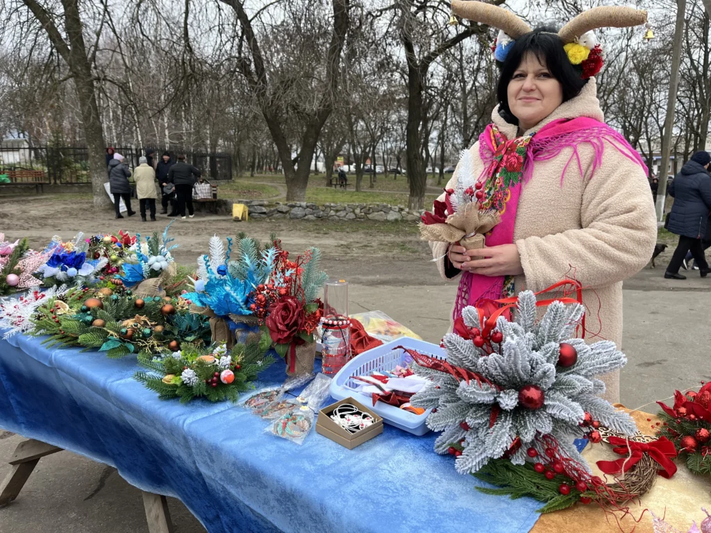 За сусіднім столом жителька Кобеляків Віта Кузема продає новорічні поробки власного виробництва. Жінка розповіла, що почала майструвати такі аксесуари з початку повномасштабного вторгнення.
