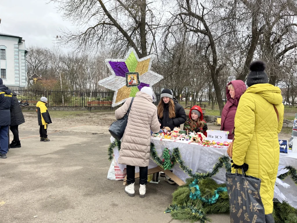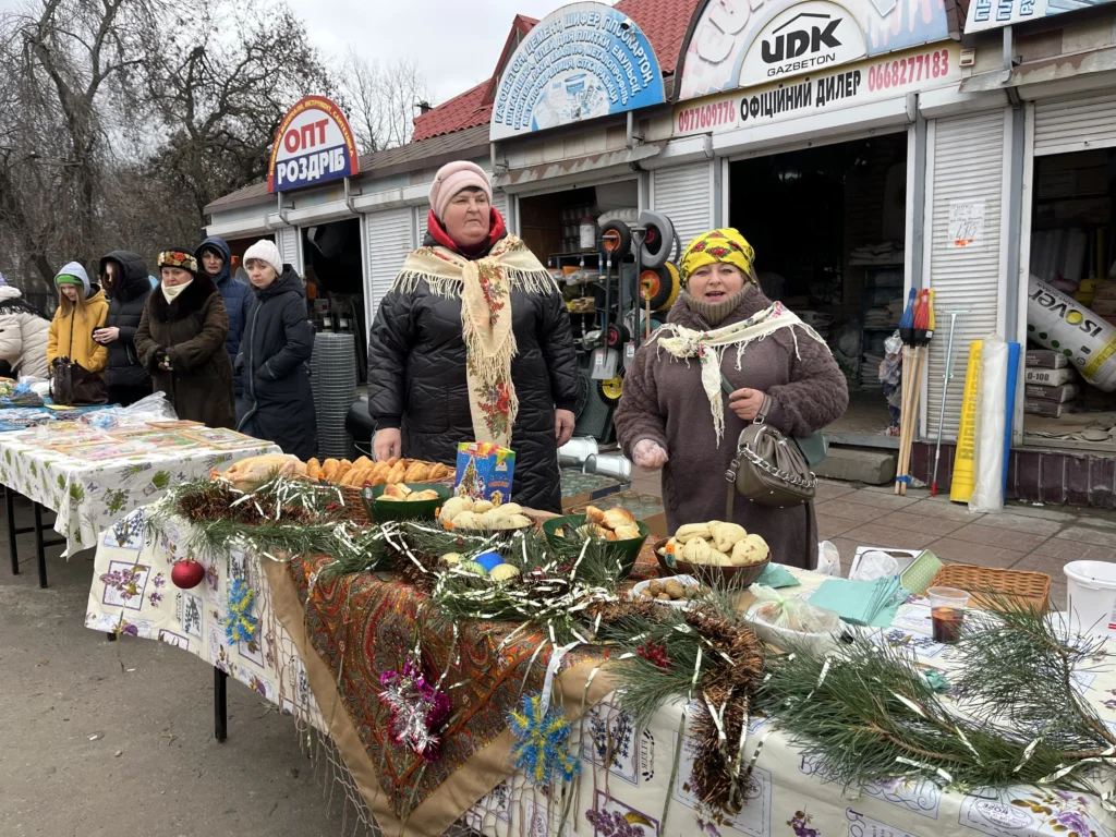 Ранок вівторка, 23 грудня, на площі Перемоги у Кобеляках є більш людним, ніж зазвичай. Навпроти базару, обабіч проїжджої частини, потроху з’являються столи – виростає новорічний благодійний ярмарок. Жінки у яскравих українських хустках розкладають речі та продукти для продажу: різноманітні солодощі, вареники, прикраси, гаманці, новорічний декор тощо.