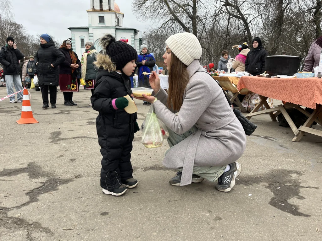 Одна з жінок мішає гарячу кашу у казані. Тарілку запашної страви підійшла спробувати переселенка з Харкова Катерина Ляшенко. Вона приїхала на ярмарок з маленьким сином, у якого тільки завершилося різдвяне свято у дитсадку.