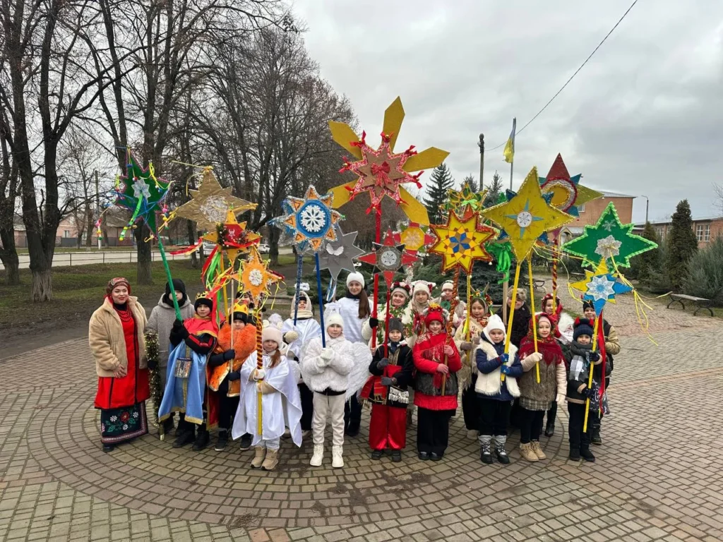 «У нас відбулося 12 зустрічей з дітьми. Це була група з 25 осіб. Під час зустрічей кожен виготовив свою різдвяну зірку як талісман. А також зробили нашу велику головну зорю, яка в діаметрі досягала 2 метрів. Також вивчили чотири колядки, змайстрували три величезних дідухи. Крім того, діти дізналися про новорічні, про різдвяні традиції, які були в різних регіонах України, і, зокрема, на Полтавщині.