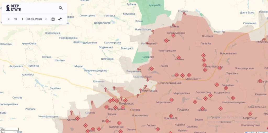 Про ситуацію на фронті дещо стало відомо від каналу воєнної аналітики DeepState. 9 лютого стало відомо, що ситуація в районі Покровська продовжує погіршуватися. Противник затягує свою піхоту в північну частину Покровська. Вхід у місто сильно обмежений. Противник активно проводить дистанційне мінування. Ділянки, які вдається розмінувати, ворог одразу заміновує. Продовжуються також постійні спроби противника зайти в Гришине, й останнім часом більша увага роботи пілотів прикута вже до цього населеного пункту, а не до Покровська, чим користується ворог.