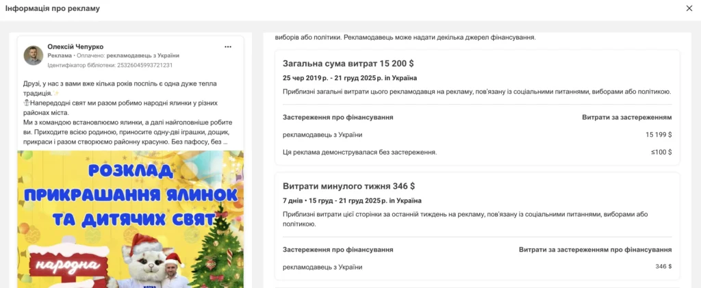 Упродовж року політик рекламував дописи зі своєї сторінки у фейсбуці майже 400 разів. Загалом за час існування цього профілю (тобто з липня 2024 року) Чепурко витратив на рекламу близько 15 тисяч 200 доларів (за теперішнім курсом – майже 636 тисяч гривень). За минулий тиждень (з 15 до 21 грудня) – 346 доларів (понад 14 тисяч гривень).