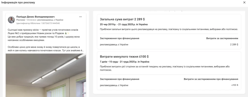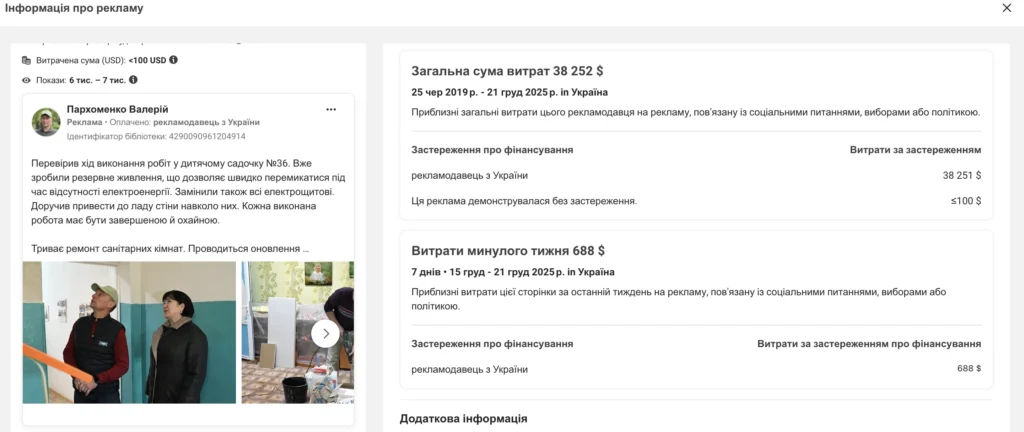 Не лише конкретні політики активно діють у соцмережах. Наприклад, у дослідженні руху «Чесно» йдеться про те, що й партія «Рідне місто» (мова про Зіньків, Полтавський район), за перші три квартали 2025 року (тобто навіть не за весь рік) витратила на рекламу дописів у фейсбуці 3,5 тисячі доларів (за теперішнім курсом близько 146 тисяч гривень).