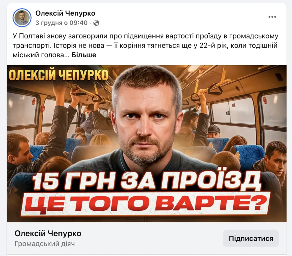За останній тиждень посадовець 15 разів ставив на рекламу свої пости у фейсбуці. Йдеться про рилси, у яких Чепурко розповідає про свою сторінку з гаслом «Я люблю Полтаву і доводжу це справами», відео про актуальні проблеми, наприклад, місцевого водоканалу, зокрема залучення підприємством колекторів для повернення боргів своїх абонентів. Про це ми писали раніше.
