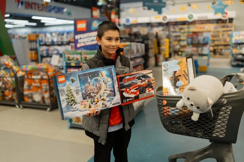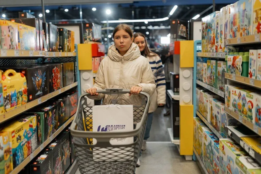 Вікторія любить малювати, і хоча вона не знала, що саме хоче купити, точно вирішила, що купить щось творче. У візку дівчинки опинилися картина-розмальовка, великий конструктор «Лего», плед, канцелярське приладдя та великий набір маркерів.