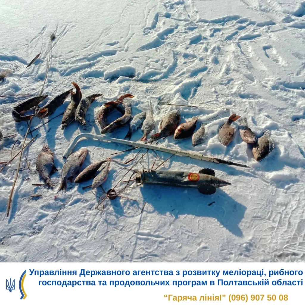 На Кам’янському водосховищі інспектори Полтавського рибоохоронного патруля виявили чоловіка, який незаконно ловив рибу з льоду за допомогою забороненої сітки.