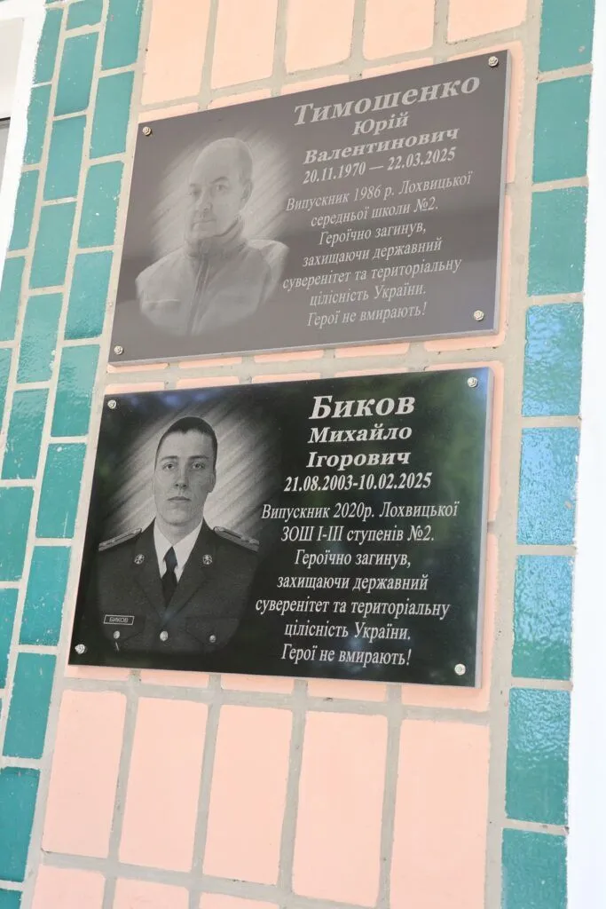 23 травня на фасаді Лохвицької школи №2 відкрили три меморіальні доки на честь полеглих захисників – Юрія Тимошенка, Сергія Ковальова та Михайла Бикова. Про це повідомляли на фейсбук-сторінці Лохвицької міської ради.