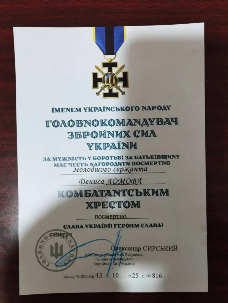 За інформацією громади, молодшого сержанта Дениса Ломова посмертно нагородили орденом «За мужність» та нагрудним знаком «Комбатантський хрест» відповідно до указу Президента України.