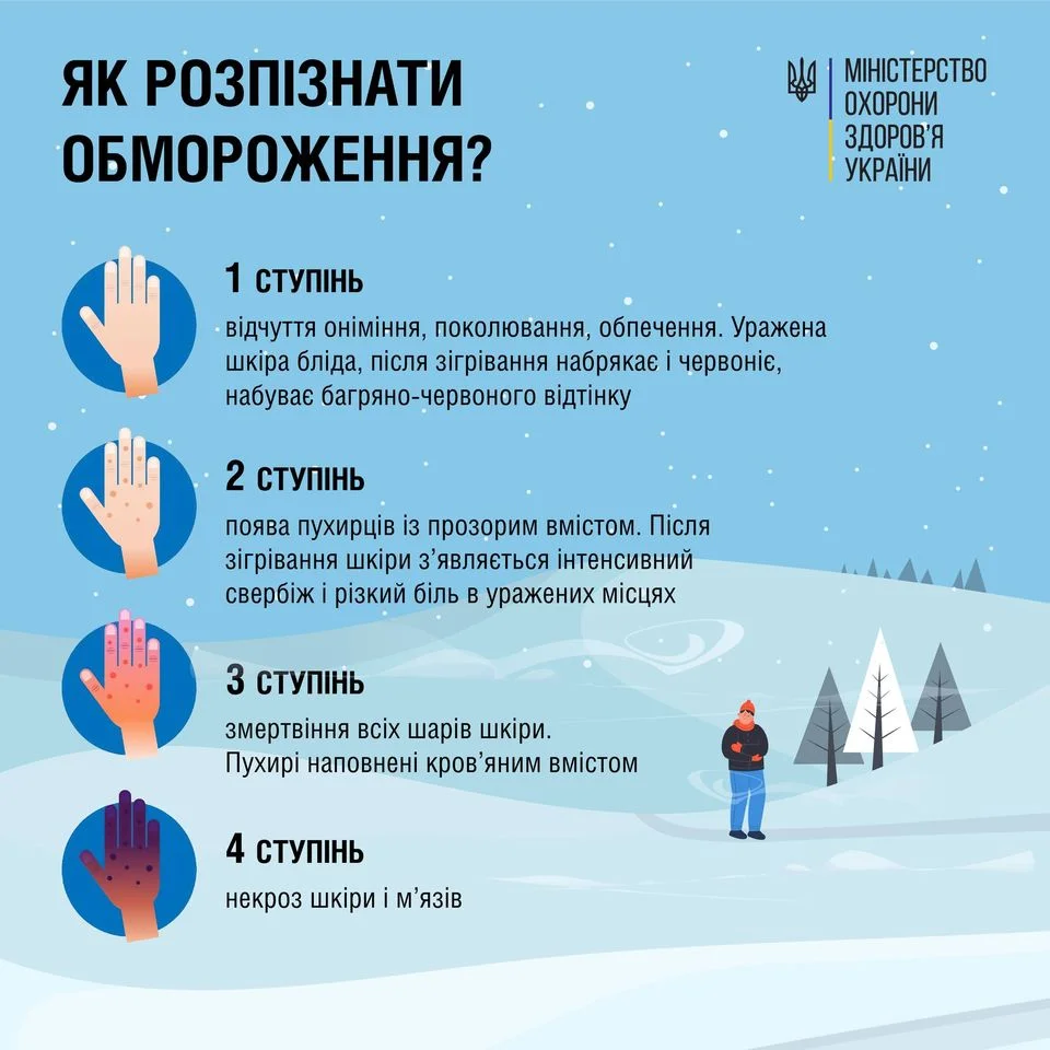 Центр громадського здоров’я інформує, що розрізняють чотири ступені обмороження: