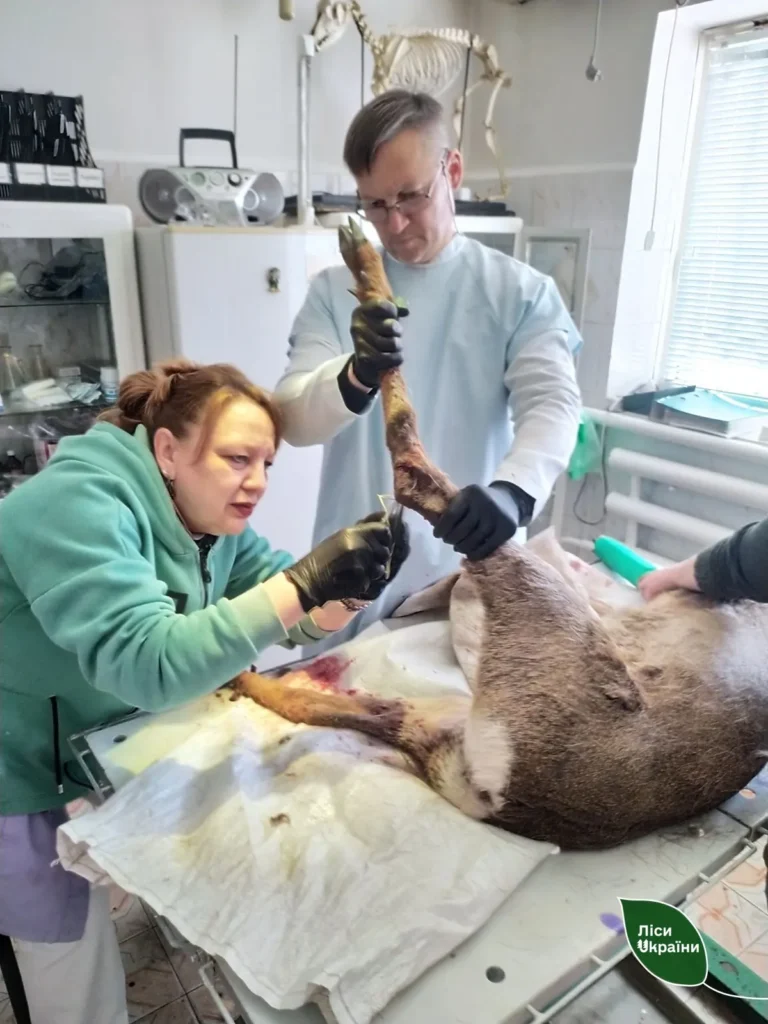 Знесилену козулю помітили поліціянти, які одразу викликали фахівців Миргородського надлісництва Слобожанської філії. Єгерська служба зреагувала миттєво: тварину обережно транспортували до місцевої ветеринарної клініки «Айболіт». Там ветлікарі надали козулі невідкладну допомогу: зупинили кровотечу, наклали шину, зашили рвані рани, ввели знеболювальне та провели комплексне обстеження.