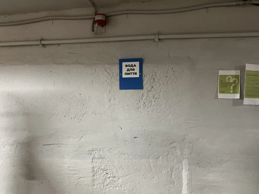 На стіні помічаємо наліпку, яка позначає місце для розміщення питної води. Хоча сама вода тут відсутня, а тому про цей недолік кажуть керівниці освітнього закладу. Вона відповідає, що воду приносять увечері, вже після завершення навчання у школі.