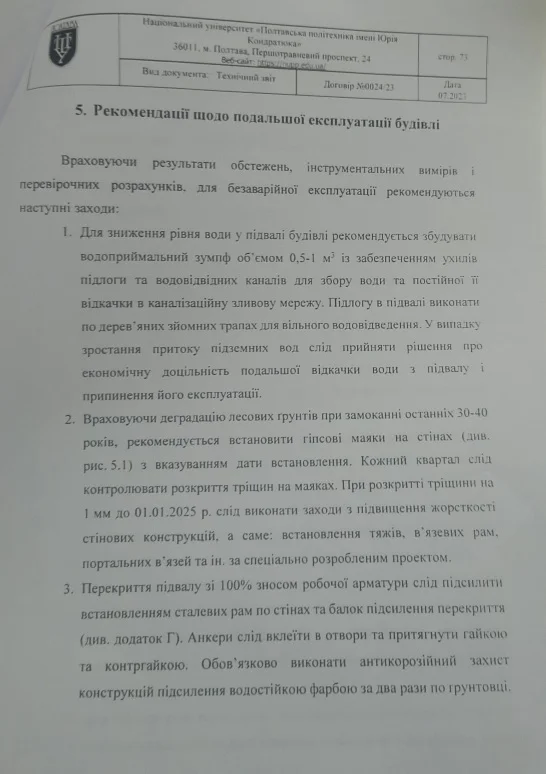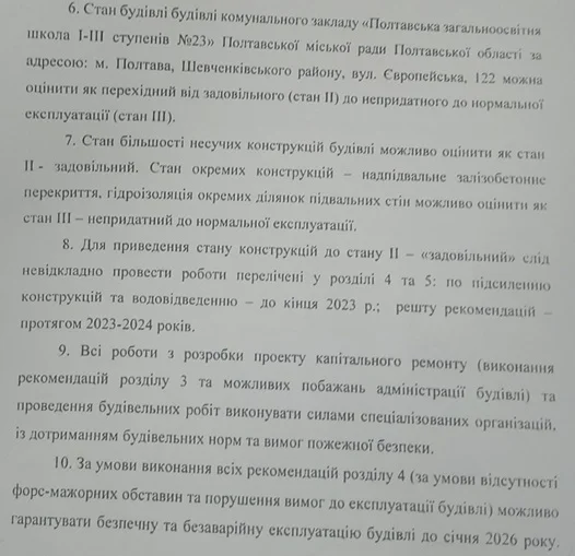 Як розповіла «Полтавській думці» мати учениці школи № 23 Наталія Шевченко, Полтавська політехніка імені Юрія Кондратюка у 2023 році виконала технічне обстеження будівлі й у своєму звіті визнала, що перекриття між підвалом і першим поверхом перебуває в аварійному стані.