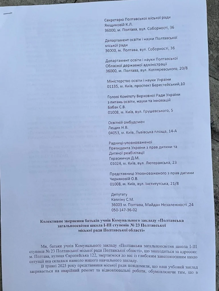 У відповіді, яку батьківська спільнота отримала від міського департаменту освіти, також була інформація, що департамент звертався до виконкому Полтавської міської ради щодо школи № 23: