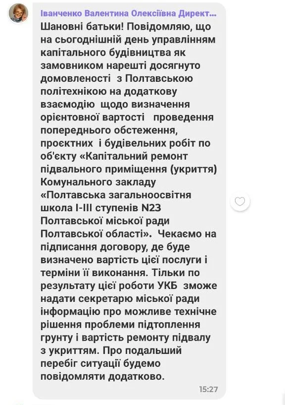 29 січня директорка навчального закладу Валентина Іванченко повідомила в чаті батькам, що Управління капітального будівництва досягнуло домовленості з Полтавською політехнікою імені Юрія Кондратюка щодо визначення вартості обстеження, проєктних і будівельних робіт із капітального ремонту підвалу (укриття) школи № 23.