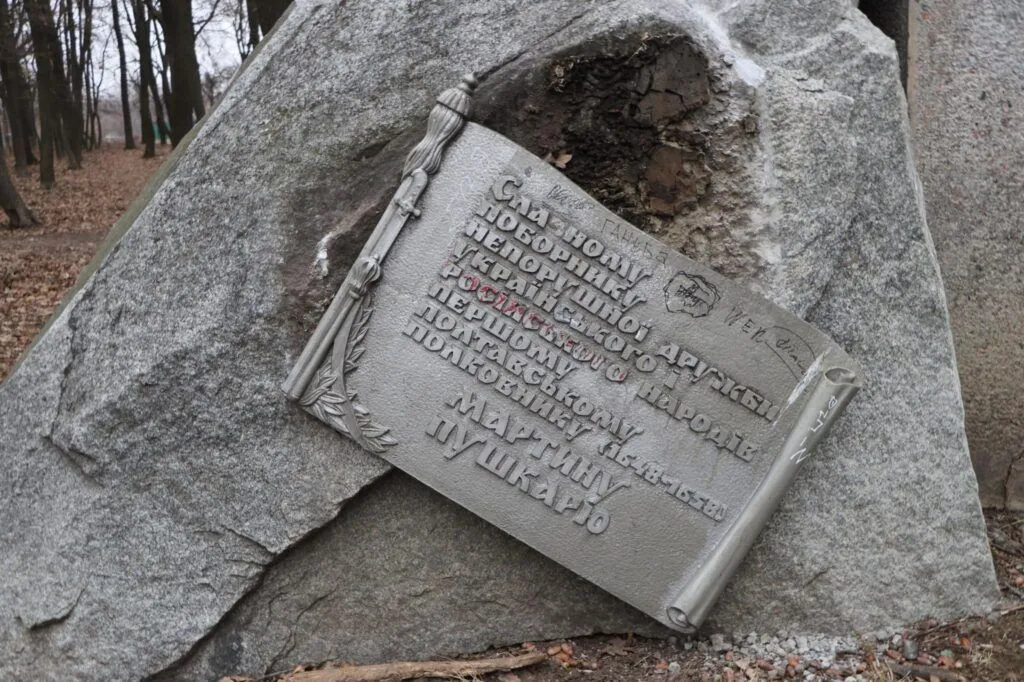 На камені біля памʼятника соратнику гетьмана Богдана Хмельницького Мартину Пушкарю демонтували пропагандистський напис. Табличку встановили ще за часів СРСР. На камені біля памʼятника був напис: «Славному поборнику непорушної дружби українського й російського народів, першому полтавському полковнику Мартину Пушкарю».