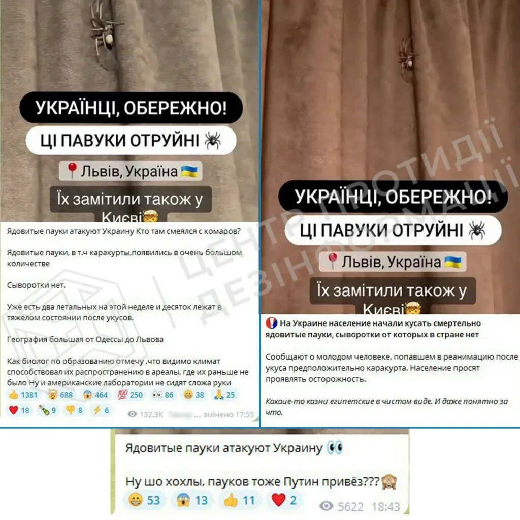 Наприкінці липня Центр дезінформації протидії дезінформації при Раді національної безпеки і оборони України повідомив, що пропагандистські ресурси поширюють повідомлення про нібито «атаку на Україну отруйних павуків». За словами російських пропагандистів, нібито вже зафіксували кілька смертей, багато людей перебувають у лікарнях. Окремі ворожі ресурси навіть пов’язують «нашестя павуків» із роботою «американських біолабораторій».