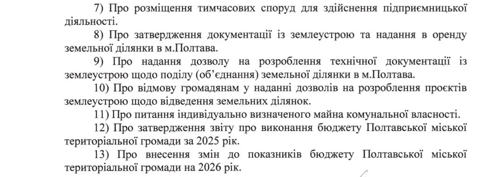 У Полтаві відбудеться позачергова сесія міської ради, на розгляд депутатів підготували 13 питань.