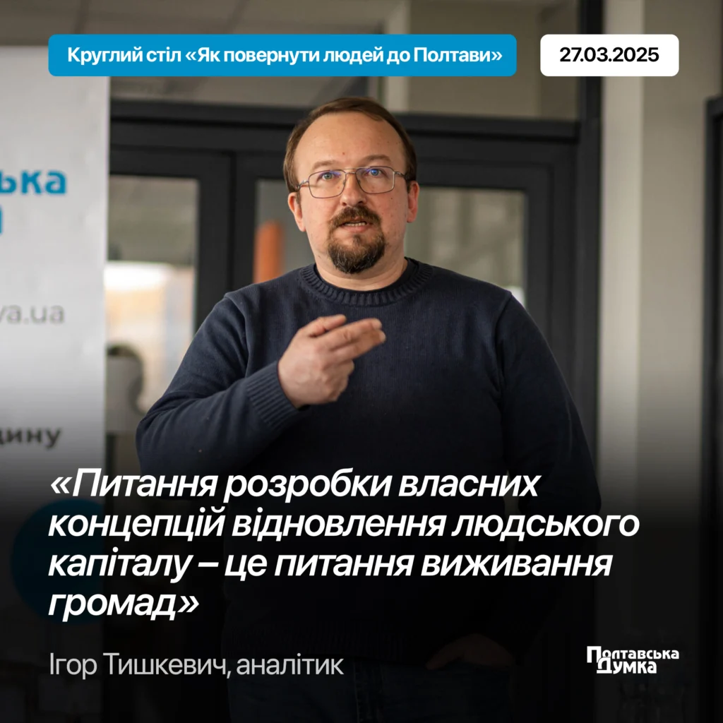 «Питання розробки власних концепцій відновлення людського капіталу – це питання виживання громад», – аналітик Ігор Тишкевич на круглому столі «Як повернути людей до Полтави»