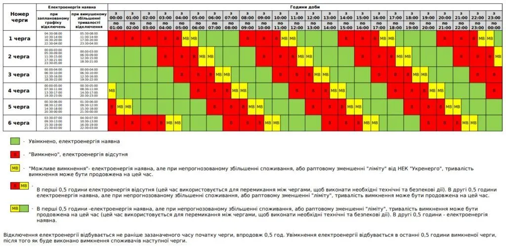 З 00:00 до 15:00 та з 22:00 до 24:00 світло вимикатимуть за таким графіком: