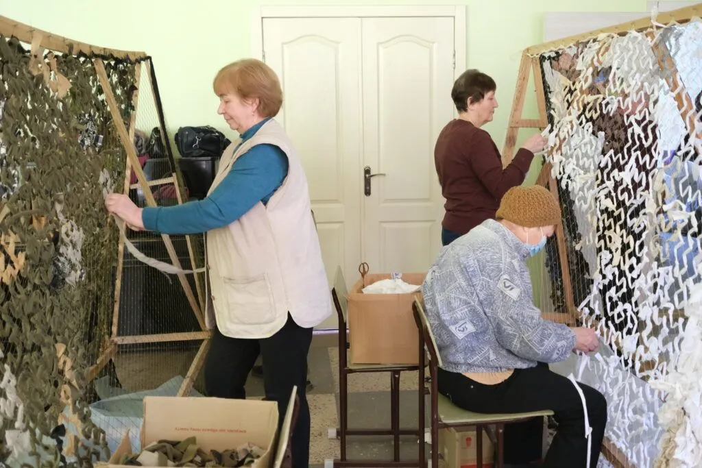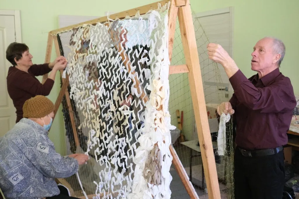 70-річний Іван Дацько гармонійно вписався в жіночий колектив. «А що зараз удома робити, коли немає ані електрики, ані води? — жартує чоловік. — Дружина Зоя першою почала плести маскувальні сітки й мене заохотила. І оце вже 6-й рік сюди ходжу. Тут потрібні й чоловічі руки, адже жінкам не так легко натягнути на каркас основу. А загалом, коли в мене запитують, чи втомлива така статична робота, чи важко вистояти на ногах пів дня, завжди відповідаю, що нашим хлопцям на фронті стократ важче. Ми тут у теплі, в добрі».