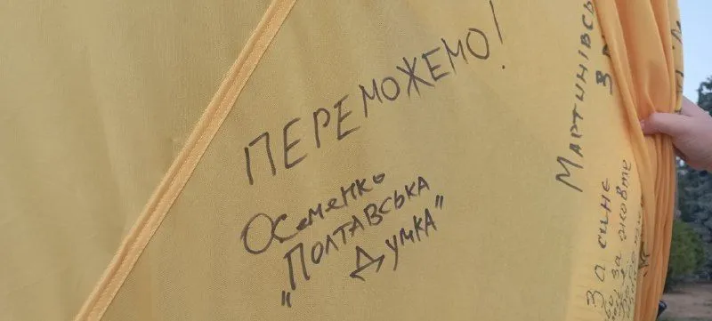 Також відомо, що полотнище підписав президент України Володимир Зеленський. Згодом цей прапор передадуть до Полтавського краєзнавчого музею, повідомляє наша кореспондентка з місця події.