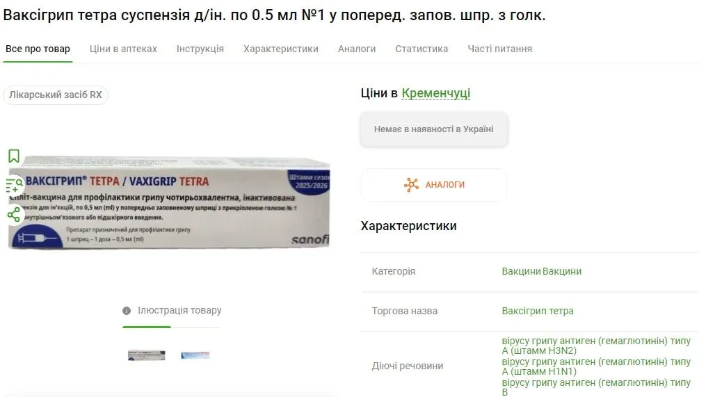Варто зазначити, що можливості купити вакцину від грипу навіть власним коштом в аптеках наразі немає. За інформацією сайту «Таблетки.юа», вакцини «Джісі Флю» та «Ваксігрип» відсутні в аптеках на всій території України.