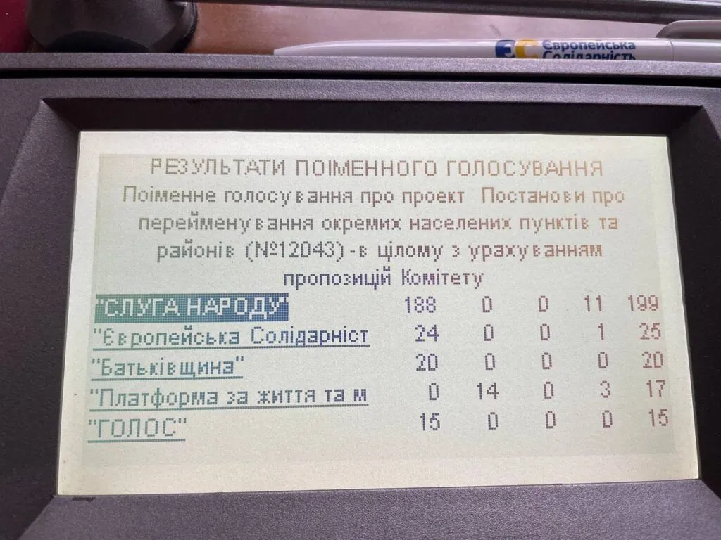 19 вересня Верховна Рада підтримала нову постанову щодо перейменування населених пунктів та районів. «За» проголосував 281 нардеп. Про це повідомив депутат Ярослав Железняк. Водночас нардепка Ірина Геращенко пише, що фракція «ОПЗЖ» не голосувала за перейменування українських міст і селищ у межах деколонізації.