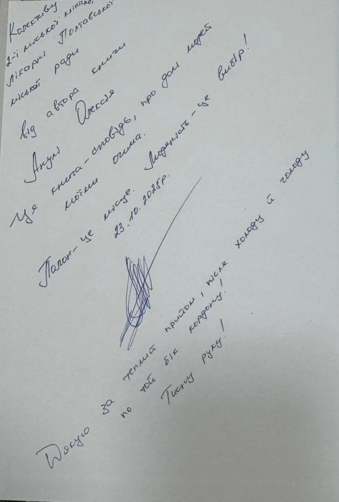 У полтавській лікарні розповіли, що ветеран подарував свою книгу й лікарям, які його реабілітували.
