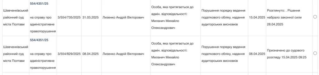 Миланич посів сьоме місце серед бізнесменів у регіоні та 327-ме – в Україні. За останні два роки, згідно з інформацією з сайту «Судова влада», бізнесмена намагалися притягнути до адміністративної відповідальності за порушення порядку ведення податкового обліку та надання аудиторських висновків.