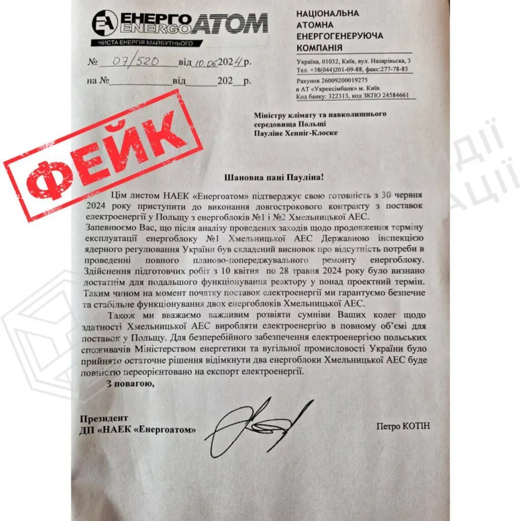 Днями в соцмережах почало «гуляти» фото листа буцімто від «Енергоатома», адресованого міністерці клімату та навколишнього середовища Польщі Пауліні Хенніг-Клосці. Суть листа – Хмельницька АЕС нібито готова почати експорт електроенергії в Польщу. Центр протидії дезінформації – робочий орган Ради національної безпеки й оборони України – заявив, що цей лист є фейковим.