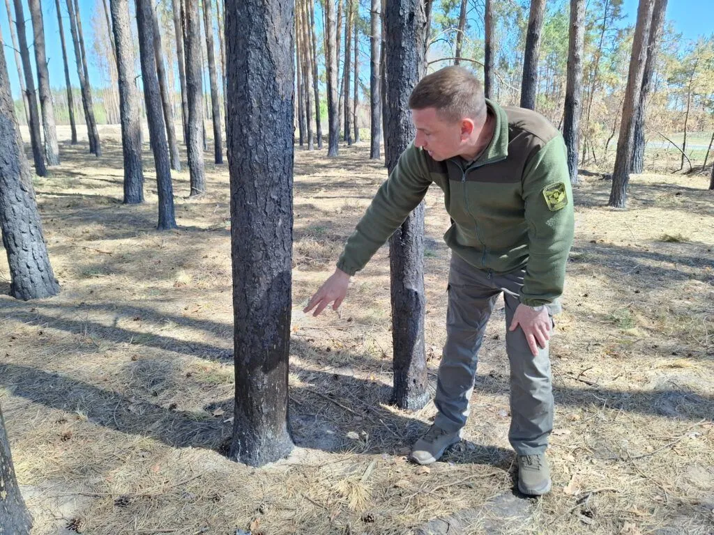 – Цим соснам 60-65 років. Ось на цій деревині кора згоріла, і вже видно, що камбій (твірна тканина стебла дерев’янистих рослин – ред.) згорів, – показує Глушко. – Вона засохне, це ми бачимо за опіками.
