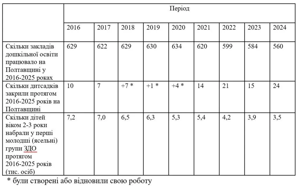Із 2016 до 2024 року на Полтавщині ліквідували чи призупинили роботу (з можливим подальшим відновленням) 79 дитячих садків. Також в обласному департаменті освіти повідомили, що протягом 2018 – 2020 років у Полтавській області були створені чи відновили свою роботу 12 дошкільних закладів. Кількість дітей віком 2-3 роки, яких набирали у перші молодші (ясельні) групи ЗДО протягом 2016 – 2025 років, поступово скорочувалася, як і кількість першокласників. У 2024 році 3,5 тисячі дітей пішли до дитячих садків – це вдвічі менше, ніж у 2016-му (тоді їх було 7,2 тисячі).
