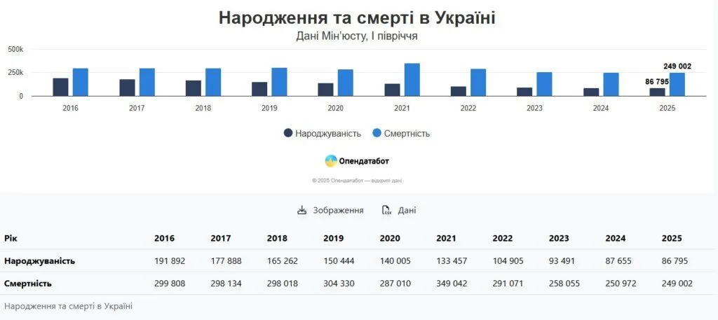 Водночас 249 002 людини померли за перше півріччя 2025 року в Україні. Наразі на новонародженого припадає троє померлих. Цей показник незмінний протягом останніх 5 років. Так, населення країни зменшується більш ніж на 300 тисяч щороку. До порівняння, у 2016 році на 1 малюка припадало 2 смертей.