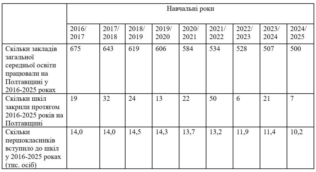 Протягом останніх дев’яти навчальних років на Полтавщині припинили існування як юридичні особи 194 школи. Як поінформували в Департаменті освіти Полтавської ОВА, з цієї кількості 99 закладів перепрофілювали у філії, а 95 – ліквідували. Із 675 закладів загальної середньої освіти, які працювали у 2016-2017 навчальному році, у 2024-2025 – залишилися 500. Кількість учнів, які на Полтавщині пішли до перших класів, за цей період скоротилася з 14 тисяч до 10,2 тисячі дітей.
