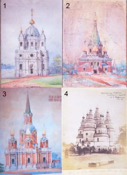 Перший проєкт був розроблений у стилі бароко середини 18 століття (зображення 1), другий – у неоросійському стилі (зображення 2), третій – у стилі так званого наришкінського бароко (зображення 3). Але жоден із запропонованих варіантів єпископу Парфенію не сподобався.