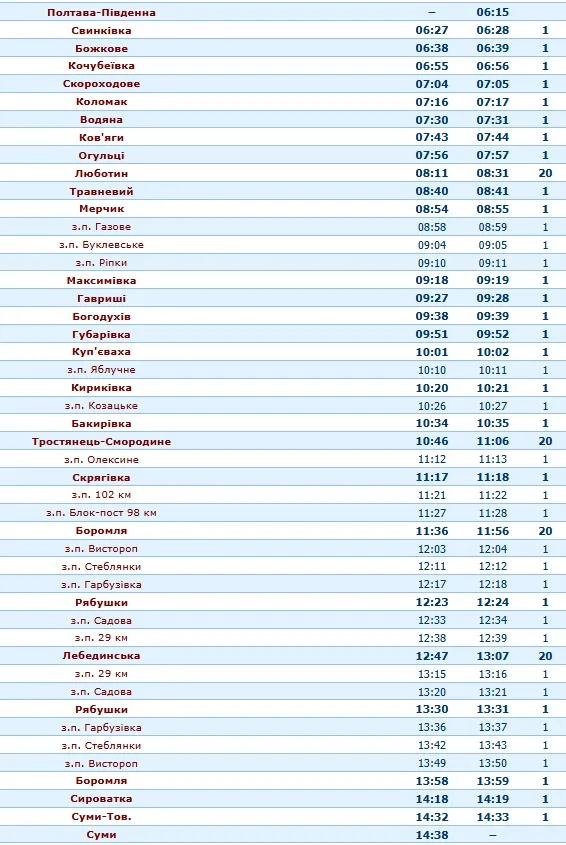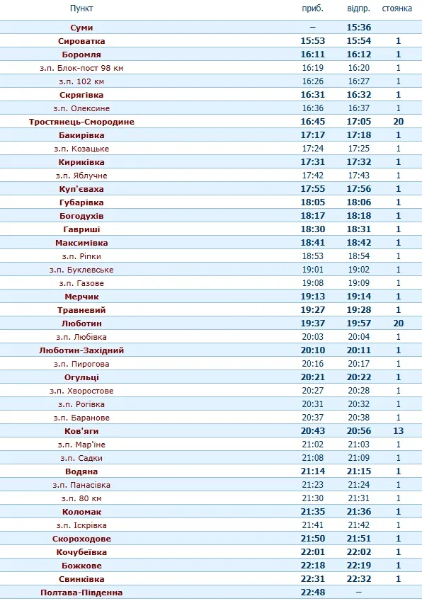 З Полтави-Південної поїзд рушатиме о 6:15 і прибуватиме в Суми о 14:38. Маршрут руху:
