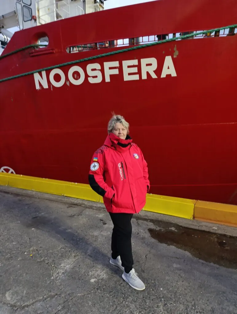 Олена біля українського науково-дослідного криголама «Ноосфера»