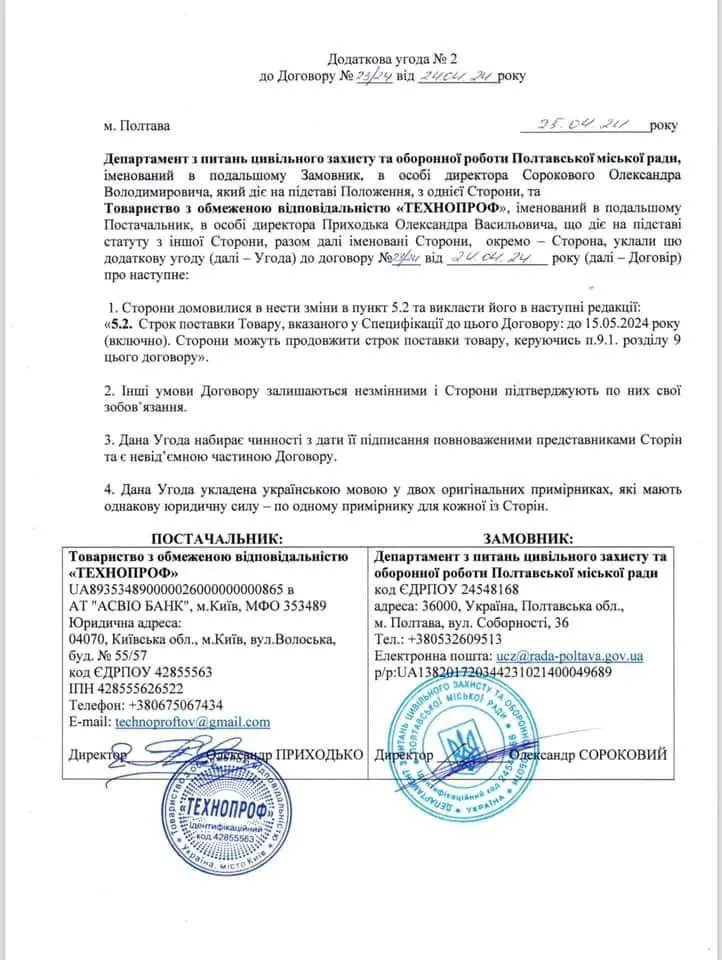 25 квітня Департамент з питань цивільного захисту та оборонної роботи Полтавської міської ради уклав додаткову угоду з ТОВ «Технопроф», яке виграло тендер на постачання квадрокоптерів на потреби військових. Цим документом внесли зміни в раніше укладений договір щодо терміну постачання товару, а саме змінили його з 30 квітня на 15 травня 2024 року.